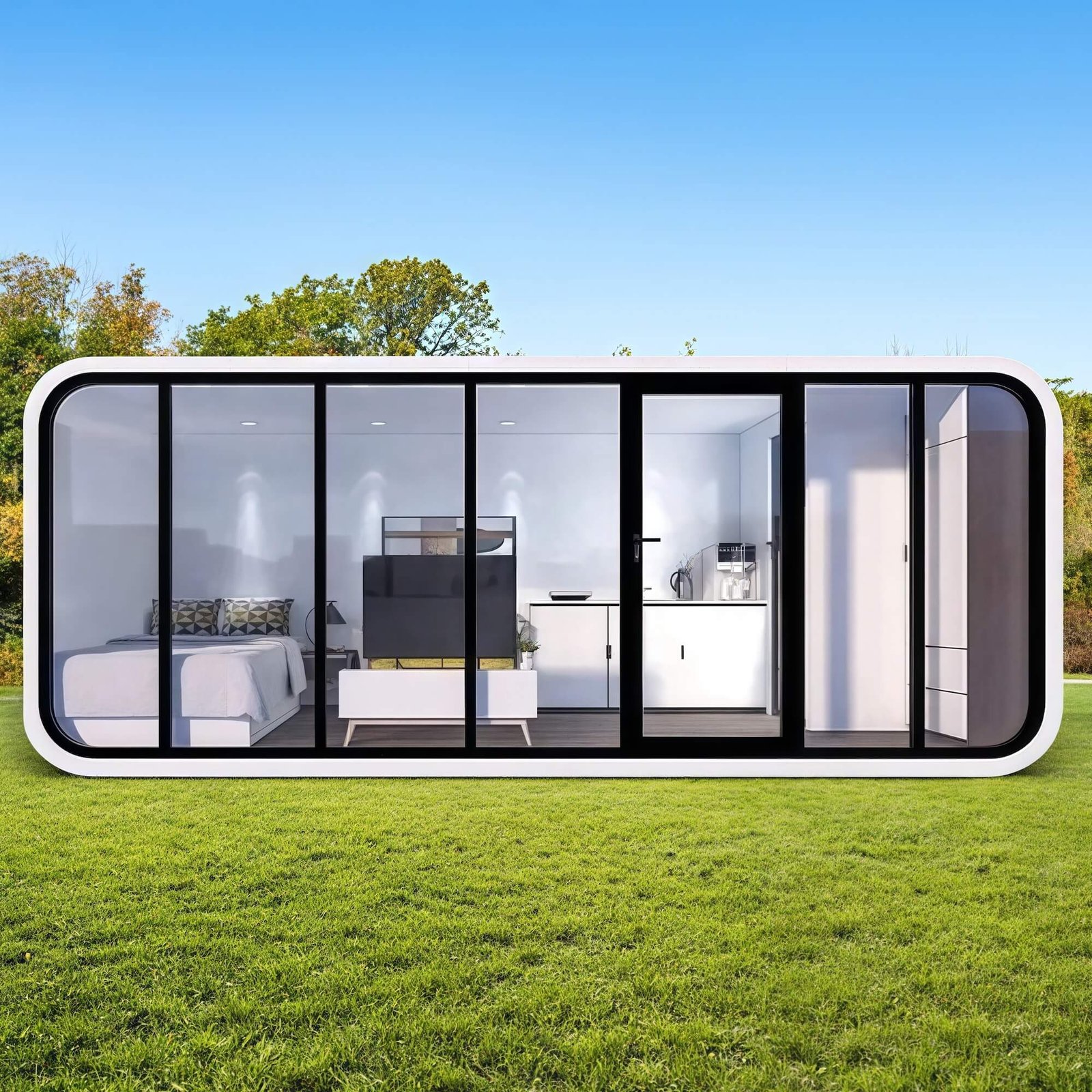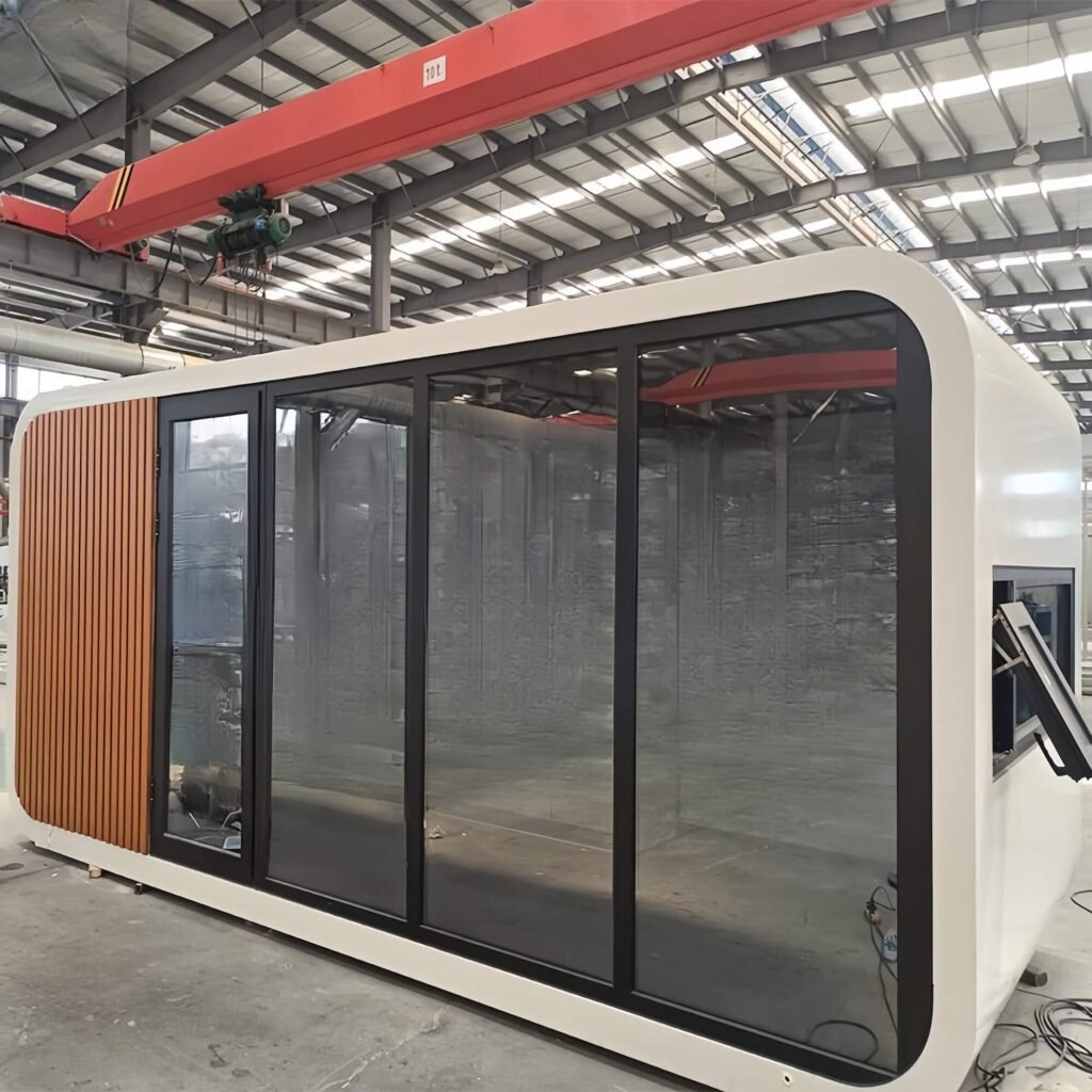 Šis 12.76 m² modulinis namelis yra kompaktiškas, tačiau išskirtinai modernus ir funkcionalus. Jo pagrindą sudaro tvirtas suvirintas plieninis rėmas, suteikiantis konstrukcijai stabilumo ir atsparumo. Išorinės sienos gaminamos iš aliuminio plokščių, dažytų milteliniu būdu — tokia apdaila atspari aplinkos poveikiui ir įgauna modernų, estetišką vaizdą.