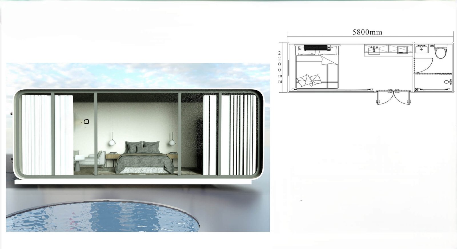 Modulyje įrengta moderni įranga: centrinis oro kondicionierius, vandens šildytuvas, dušas ir išmanioji durų užrakinimo sistema. Taip pat integruotas LED apšvietimas, kuris papildo šiuolaikišką dizainą.